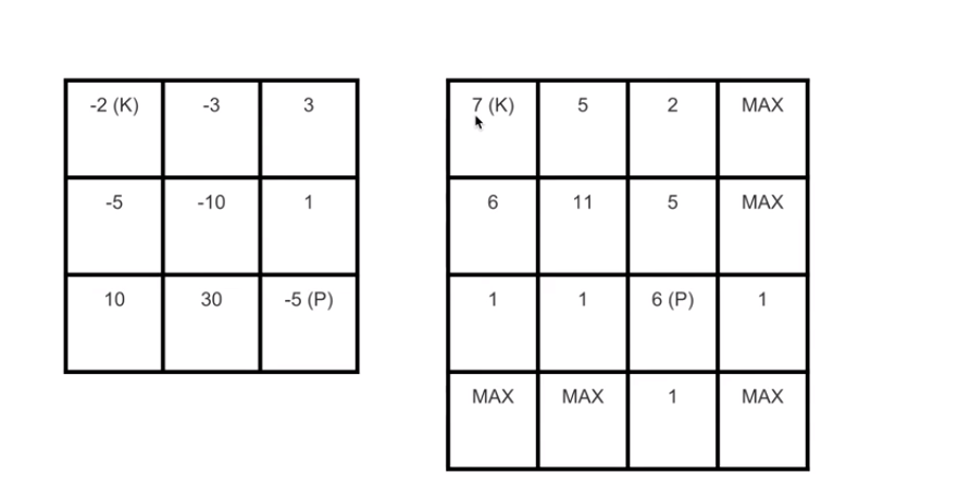 For example, given the dungeon below, the initial health of the knight must be at least 7 if he follows the optimal path RIGHT-> RIGHT -> DOWN -> DOWN.