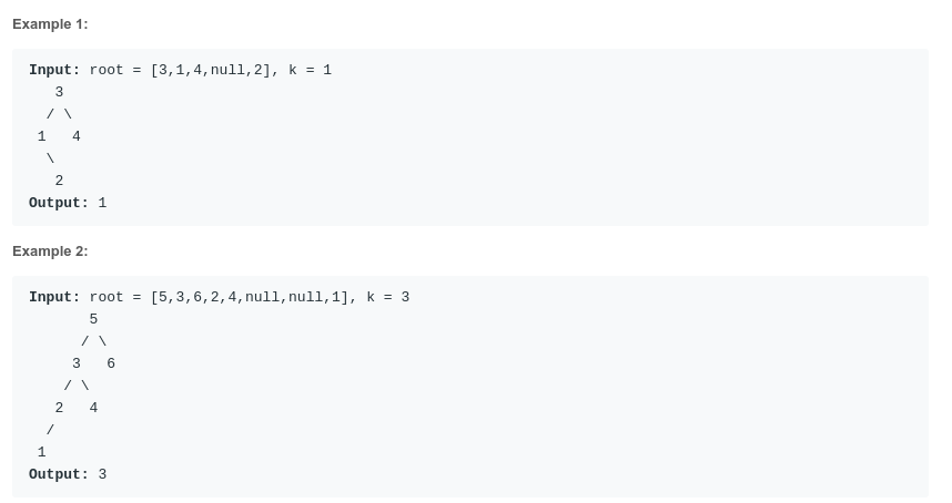 In order to get the k-th smallest element in a BST, we can use the inorder traversal property to get a sorted array. (left < root < right). There are two ways to solve this problem: recursive or no-recursive.