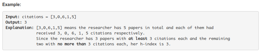 - 从前往后查找排序后的列表,直到某篇论文的序号大于该论文被引次数。所得序号减一即为H指数。
