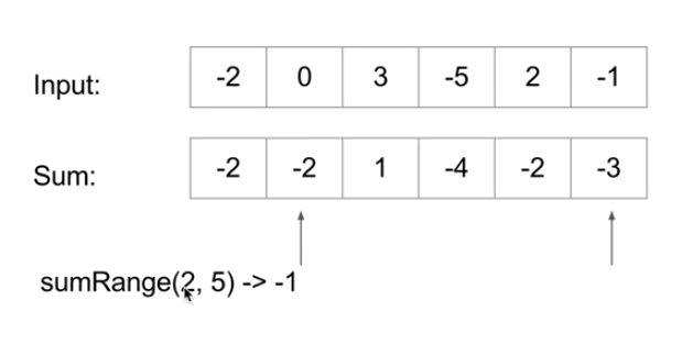 Given nums = [-2, 0, 3, -5, 2, -1] sumRange(0, 2) -> 1 sumRange(2, 5) -> -1 sumRange(0, 5) -> -3