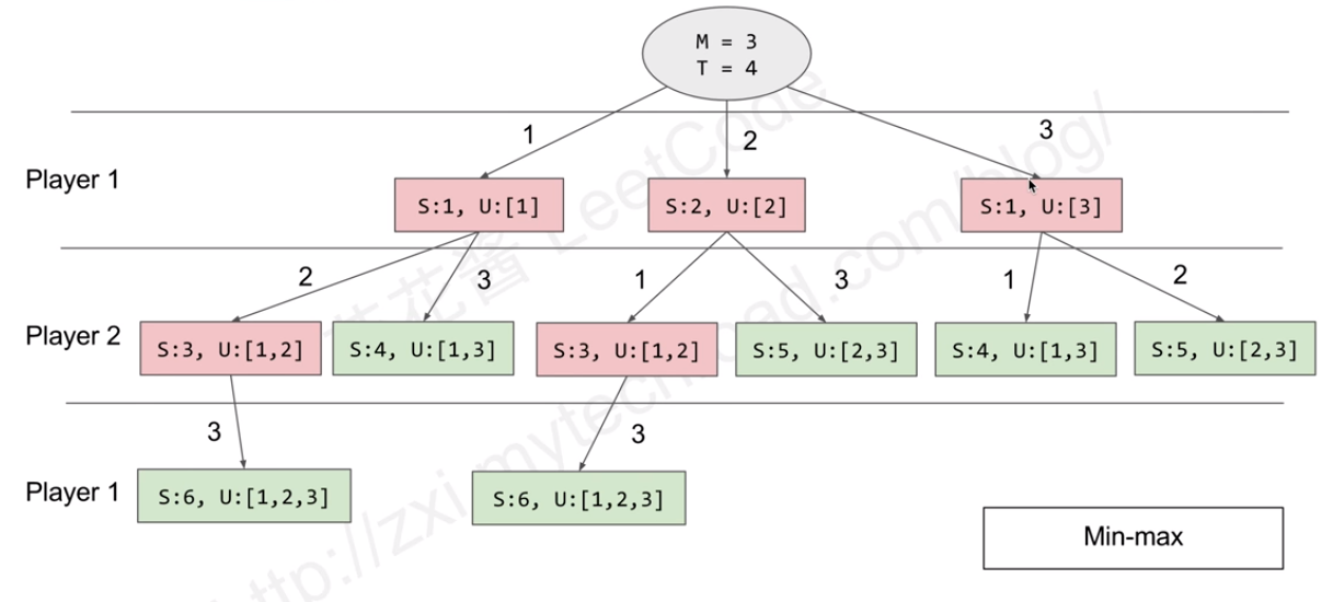 有一个博弈论相关的方式,使用递归,每次走最好的一步,默认对手也走最好的一步. 这道题目需要求解第一个player有没有机会取得胜利,但是这可能会让另外一个player没有机会胜利的情况也是返回true的。
