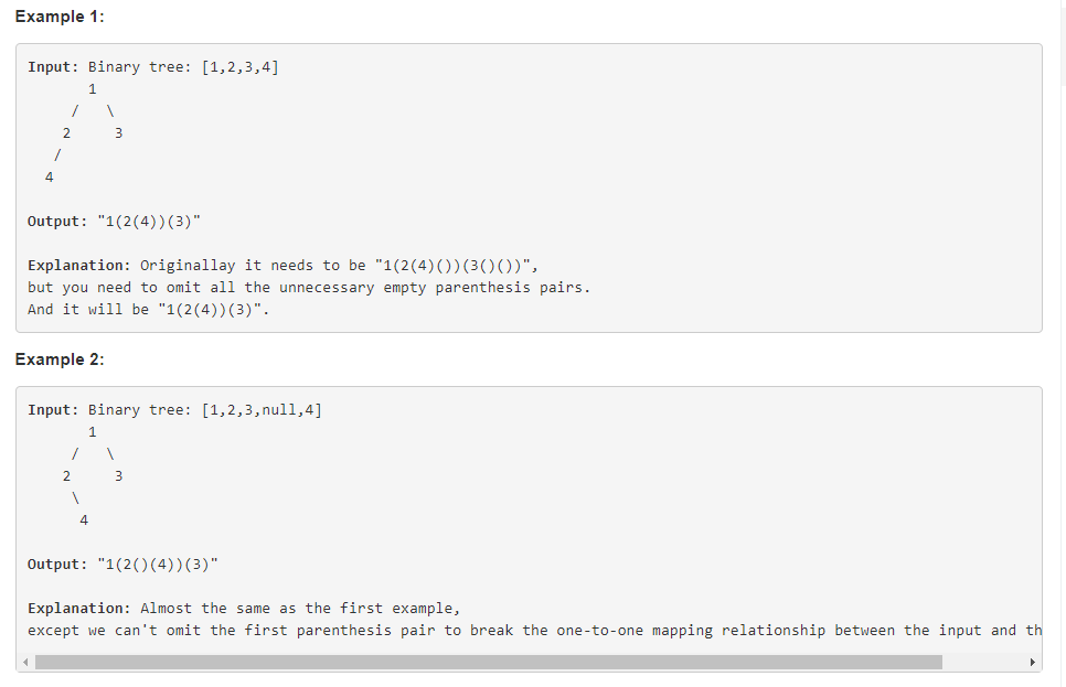 The null node needs to be represented by empty parenthesis pair "()". And you need to omit all the empty parenthesis pairs that don't affect the one-to-one mapping relationship between the string and the original binary tree.