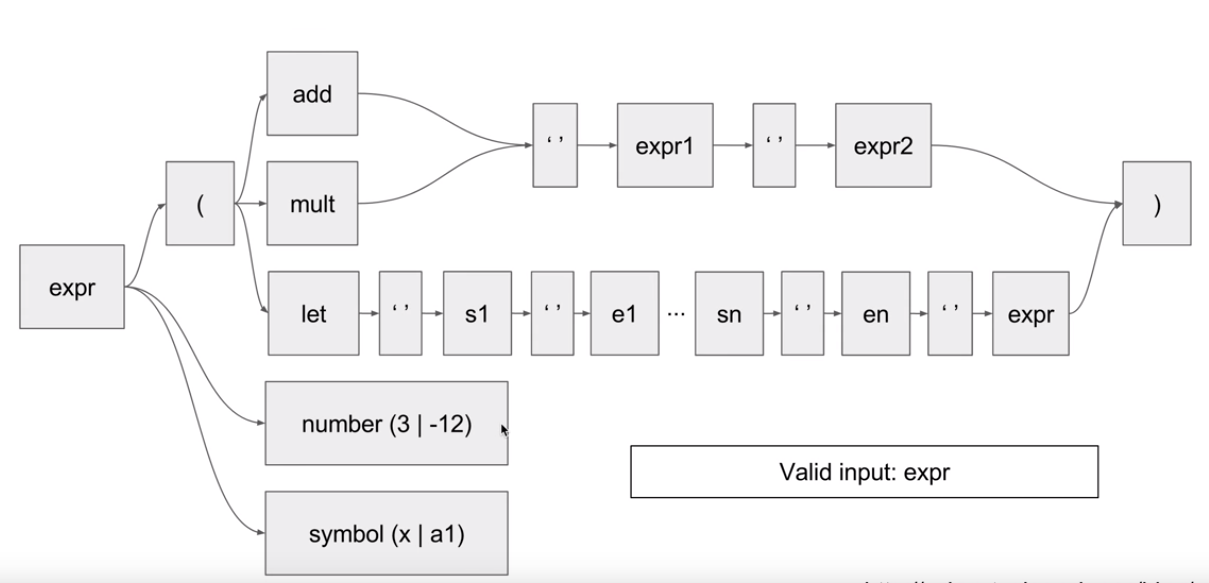 (mult e1 e2)wheremultis always the string"mult", there are always two expressionse1, e2, and this expression evaluates to the multiplication of the evaluation ofe1and the evaluation ofe2.For the purposes of this question, we will use a smaller subset of variable names. A variable starts with a lowercase letter, then zero or more lowercase letters or digits. Additionally for your convenience, the names "add", "let", or "mult" are protected and will never be used as variable names.