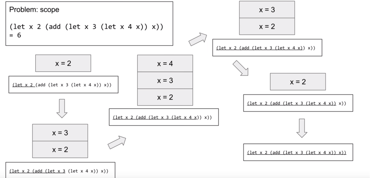 Input: (let x 2 (add (let x 3 (let x 4 x)) x)) Output: 6 Explanation: Even though (let x 4 x) has a deeper scope, it is outside the context of the final x in the add-expression. That final x will equal 2.