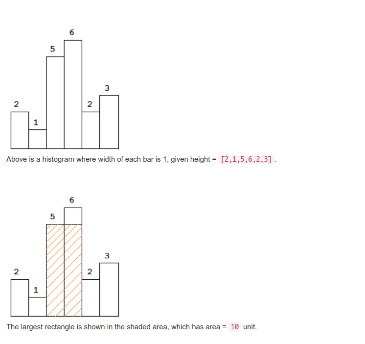 方案二(Solution 2): 维护一个单调栈,用来保存递增序列,相当于上面那种方法的找局部峰值。我们可以看到,直方图矩形面积要最大的话,需要尽可能的使得连续的矩形多,并且最低一块的高度要高。有点像木桶原理一样,总是最低的那块板子决定桶的装水量。