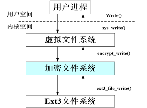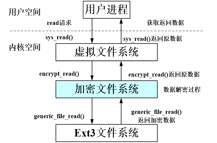 当用户发起read操作,加密文件系统中相关函数就被VFS中的系统调用sys_read()调用来处理这一个请求,他必须首先调用下层文件系统的read()以读取加密过的文件数据,然后解密文件数据,最后将解密后的原数据返回给用户。