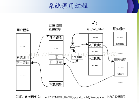 所有系统调用陷入内核前,需要将系统调用号一起传入内核,而该标号实际上就是系统调用表的下标,在i386上,这个传递工作是通过在执行int $0x80前把调用号装入eax寄存器来实现的,这样系统调用处理程序一旦运行起来,就可以从eax中得到系统调用号,然后再到系统调用表中去寻找相应的服务例程。