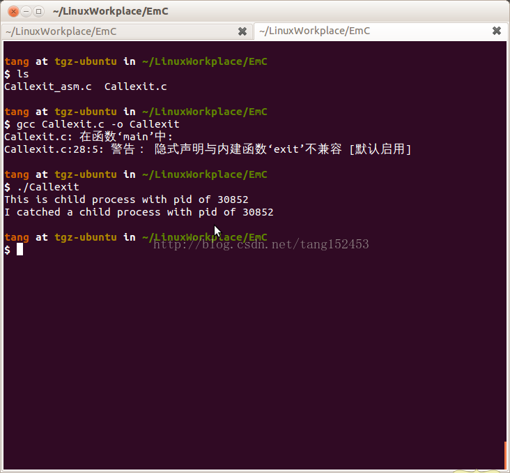 在这里,使用的系统调用中的exit()来进行系统调用实践,下面是C语言程序,主要的功能是父进程fork()一个子进程,然后子进程沉睡5秒钟后僵死,父进程等待子进程退出之后回收子进程。